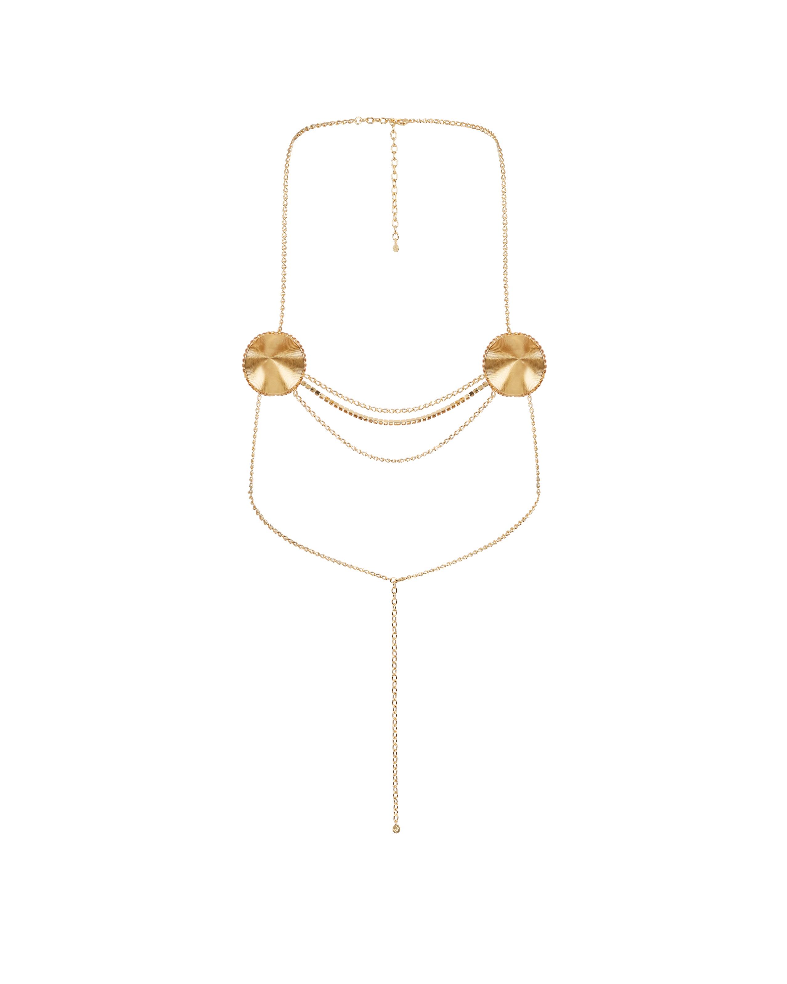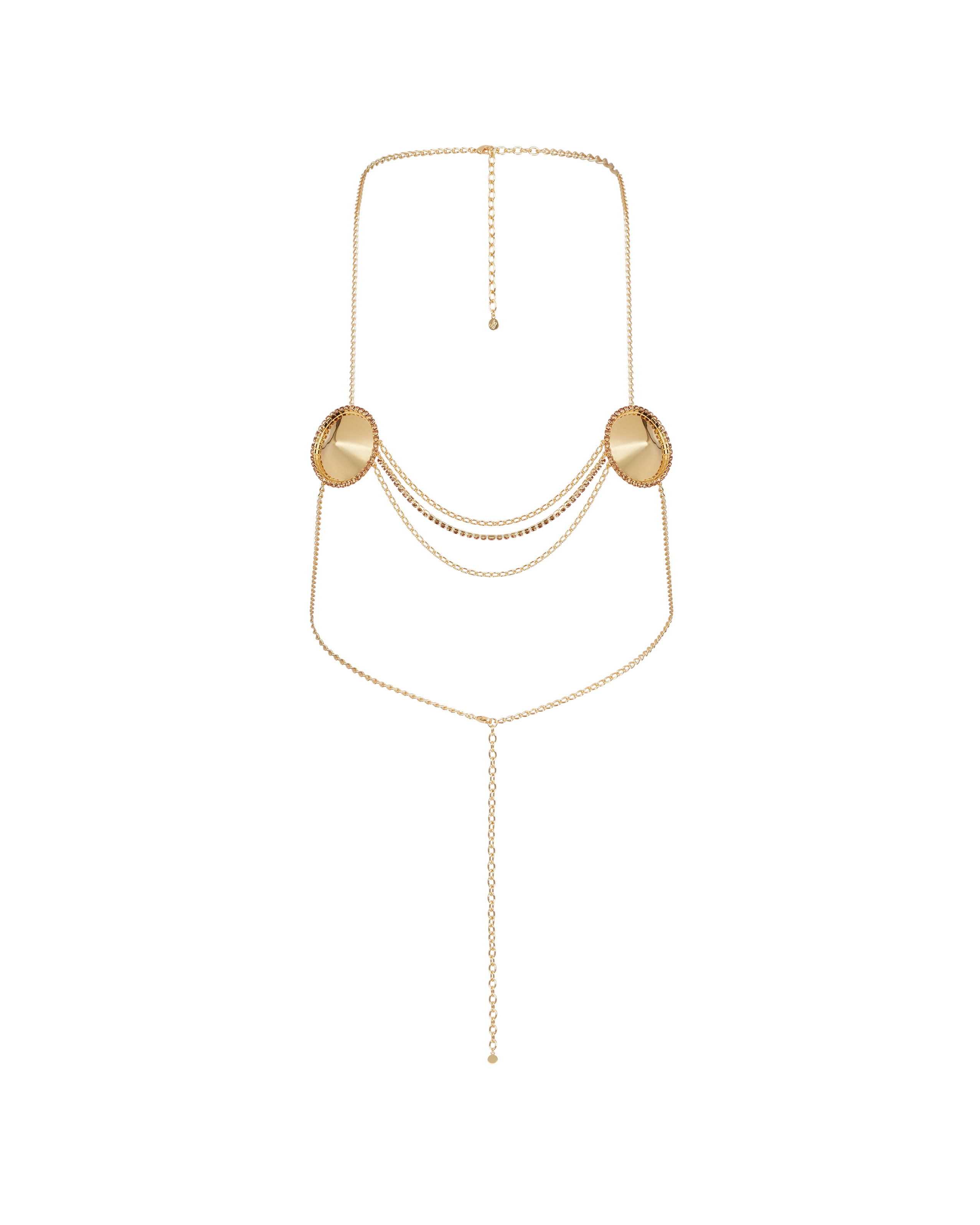 Накладки Lucia с золотистым покрытием декорированы кольцами с кристаллами по краю и ниспадающими цепочками. Регулируемая застежка. В комплекте две пары клейких стикеров. Идеальное дополнение к комплекту Lucia для дерзкого гламура.