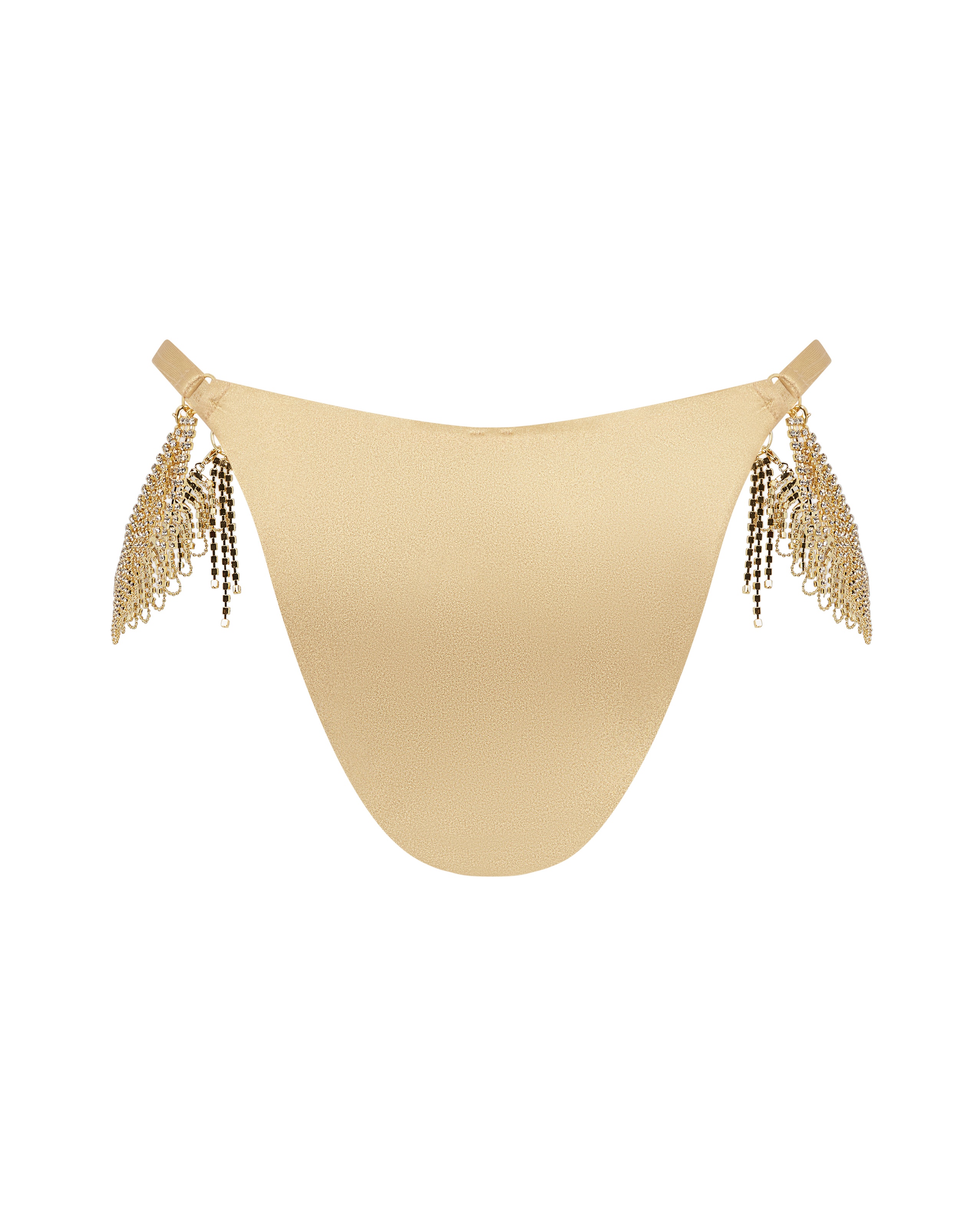 Плавки-танга Cassiana золотистого цвета из итальянской ткани для купания с металлизированной отделкой. На передней части бедер свисает несъемная кисть со стразами. Съемная позолоченная цепочка со стразами ниспадает на бедра, с деталями из тонкой цепочки с шариками между кистями цепочки. Идеальный комплект с топом Cassiana для ослепительного образа.