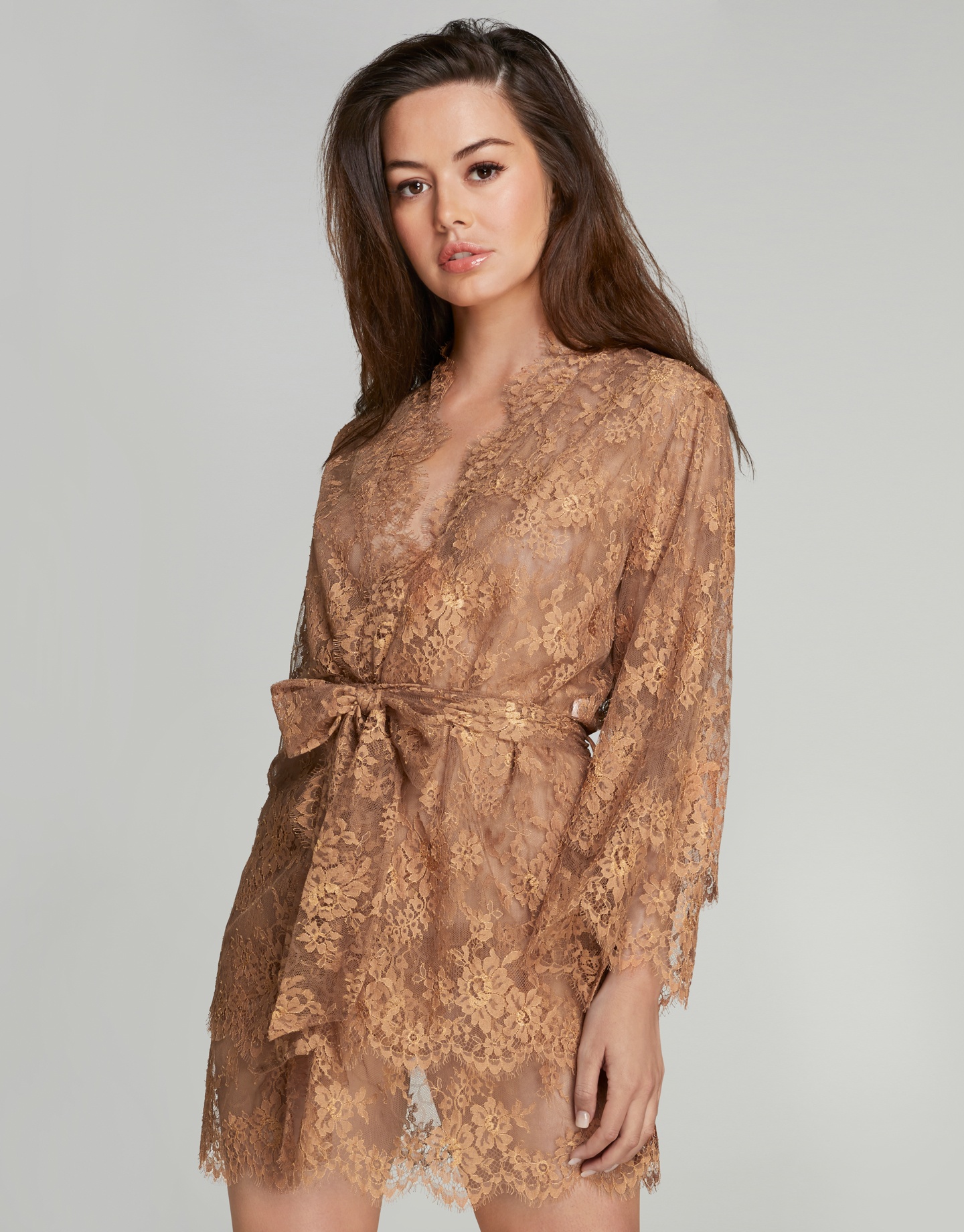 Полупрозрачное кимоно Carline выполнено из кружева с цветочным мотивом. Благородный золотистый оттенок выигрышно смотрится в классическом крое. Фестончатые края украшают срезы. Манжеты и низ дополнены двумя рядами кружева. Модель идеально гармонирует с бюстгальтером и трусиками или сорочкой из коллекции, вдохновленной блеском золота.