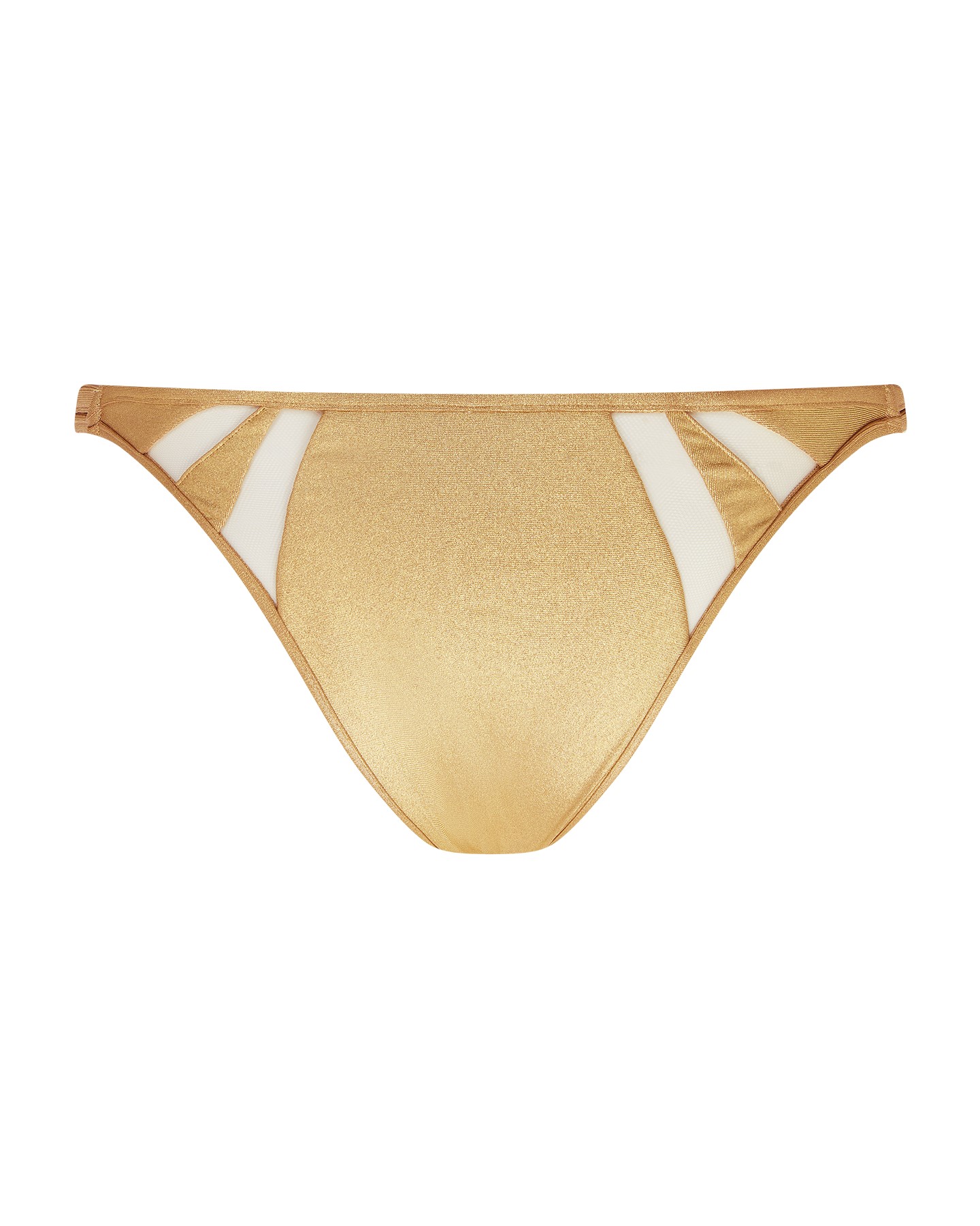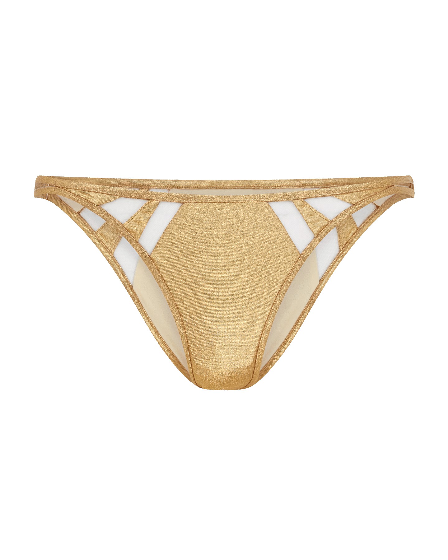 Золотые плавки купальника Tora выполнены из эластичной ткани с низкой посадкой. Прозрачные панели из тюля добавляют игривости, а в сочетании с верхом Tora создают идеальный образ для отдыха у бассейна.