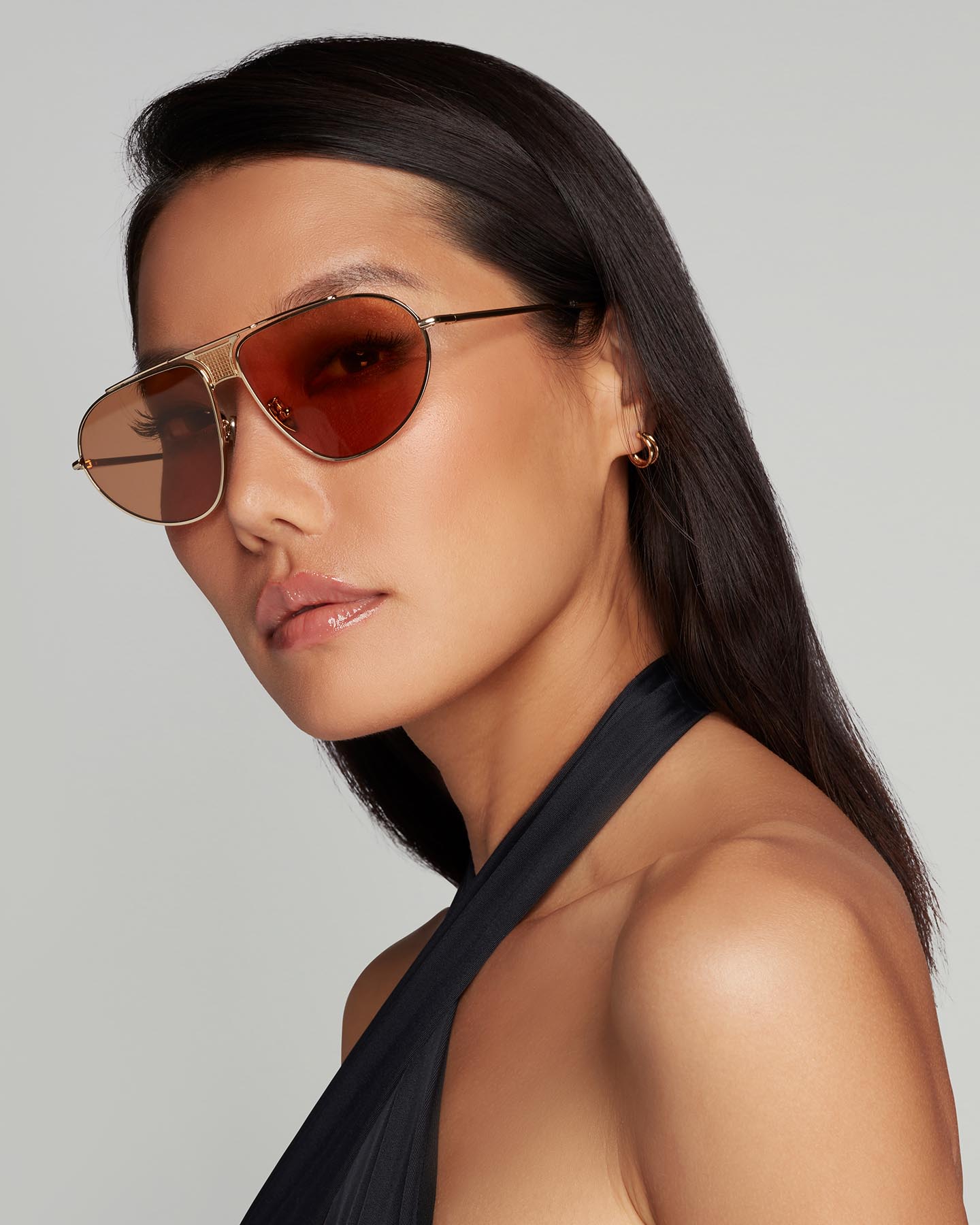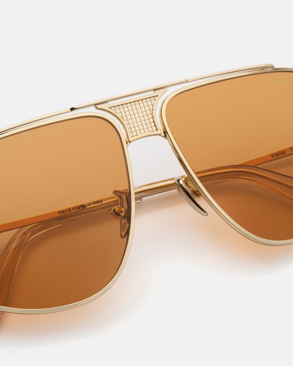 Солнцезащитные очки-авиаторы из коллекции Kelie выполнены в золотистых тонах. Линзы с коричневой тонировкой обладают защитой от UVA и UVB излучений.